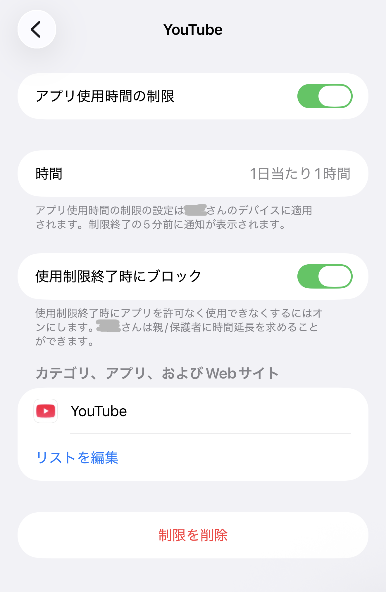 - Youtubeアプリの使用時間の制限を1時間に設定